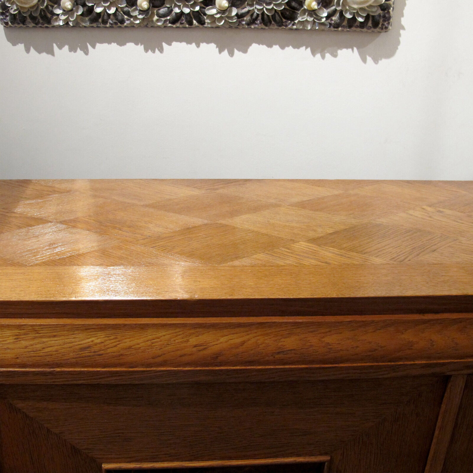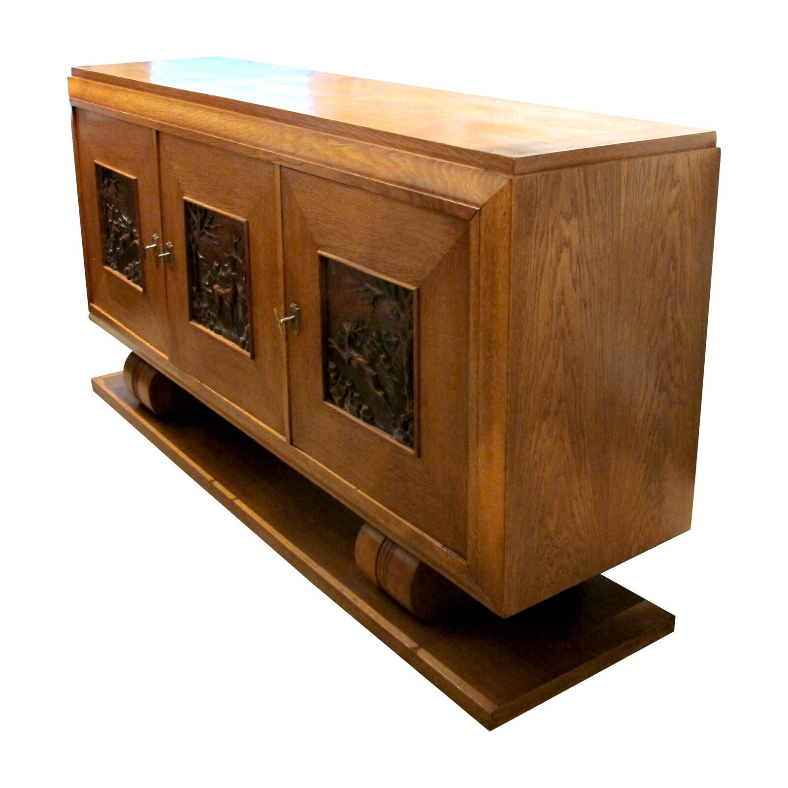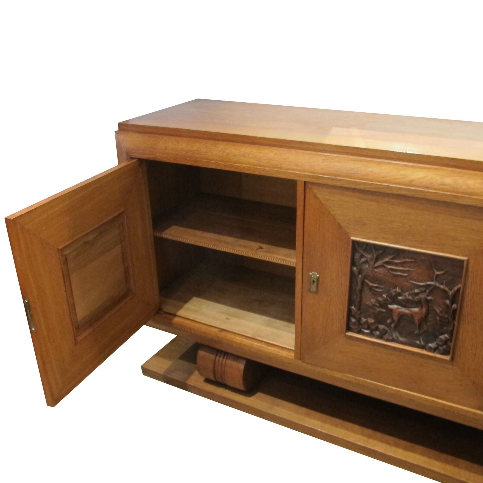 Large French sideboard designed by Charles Dudouyt in the 1950s, crafted in solid oak. The design is defined by its strong proportions and clean architectural lines. The front features three doors, each with a deeply carved wooden panel depicting stylised woodland scenes. The warm oak surface shows a fine grain and a well-preserved patina. Raised on a stepped plinth base with rounded block feet, the sideboard offers generous interior storage and combines practicality with decorative presence.