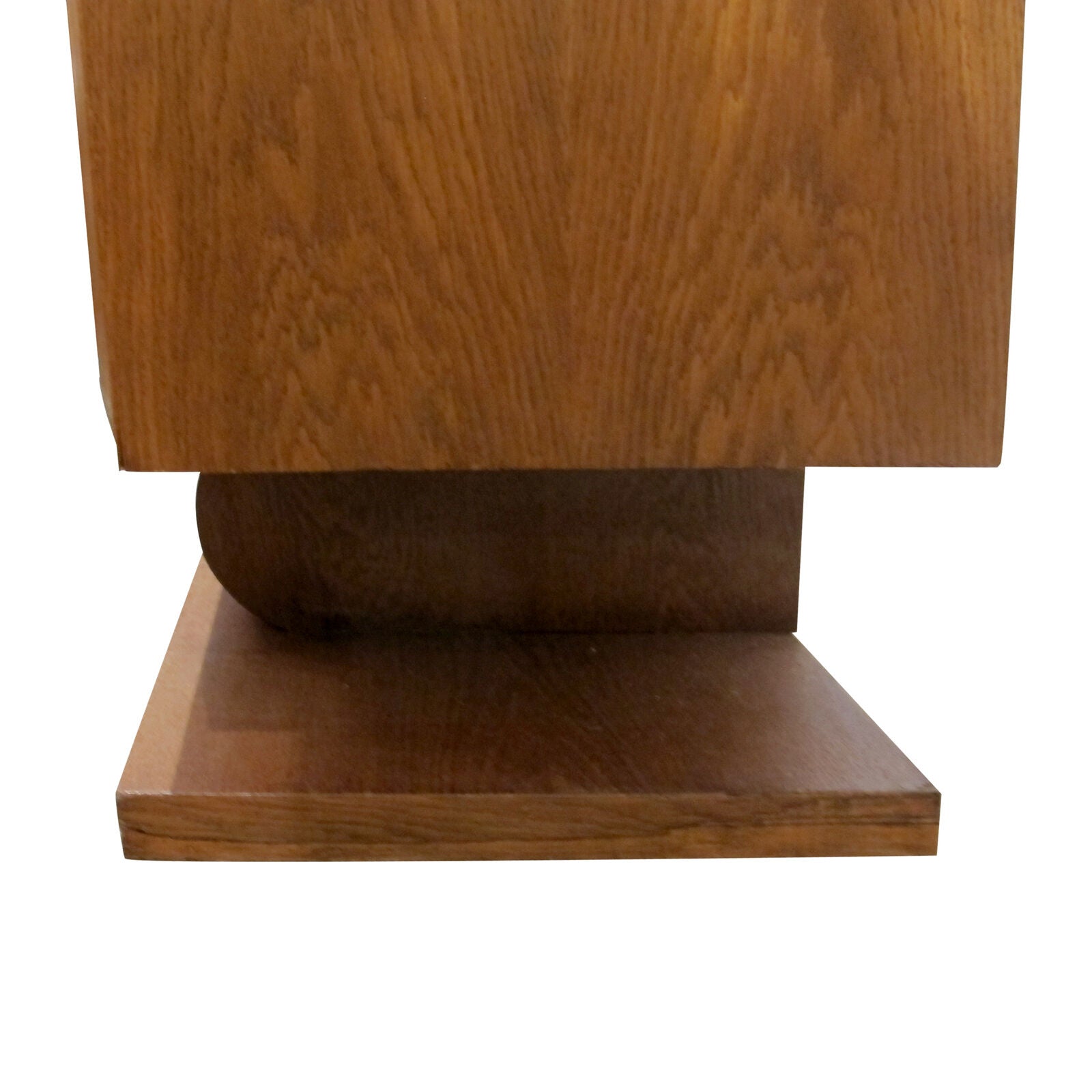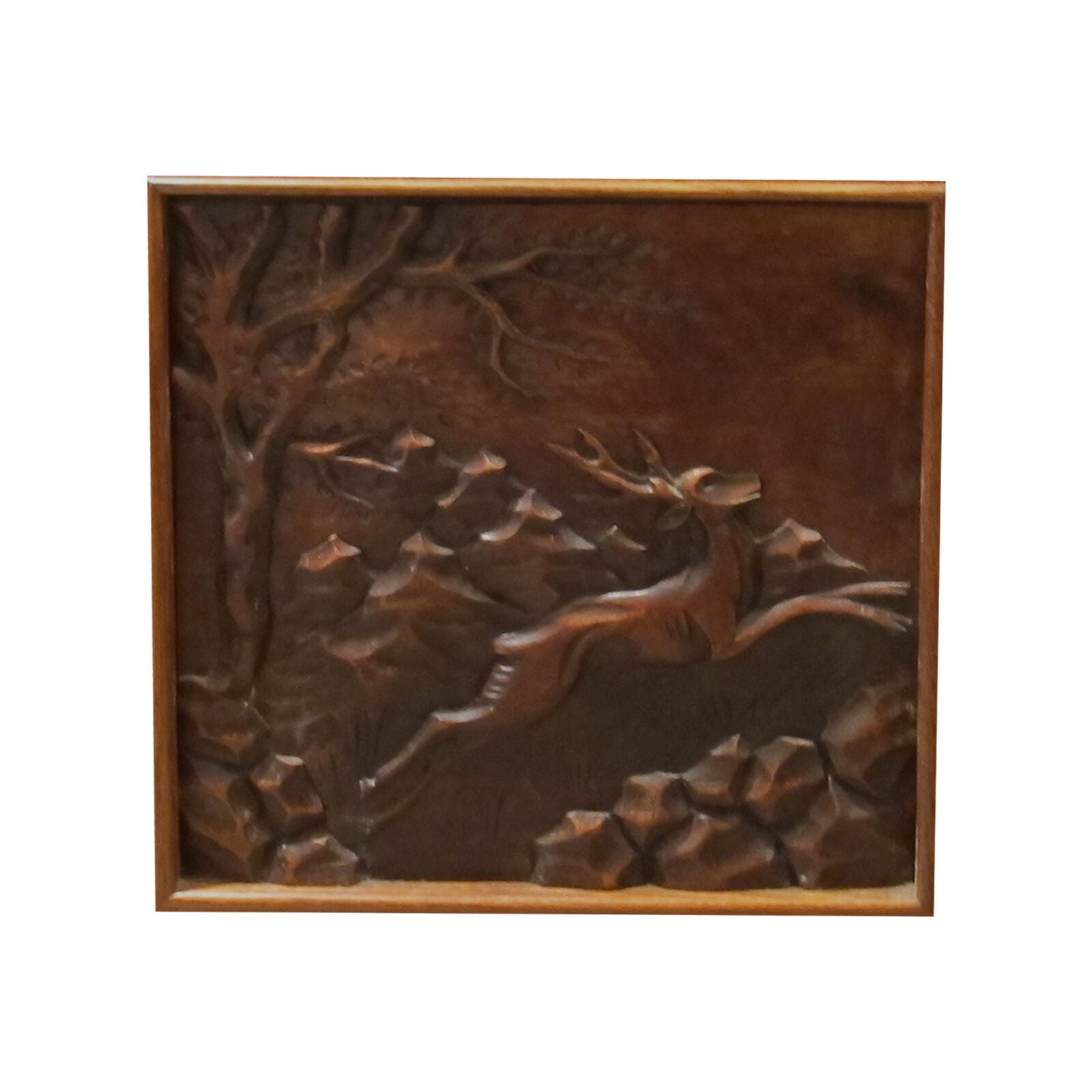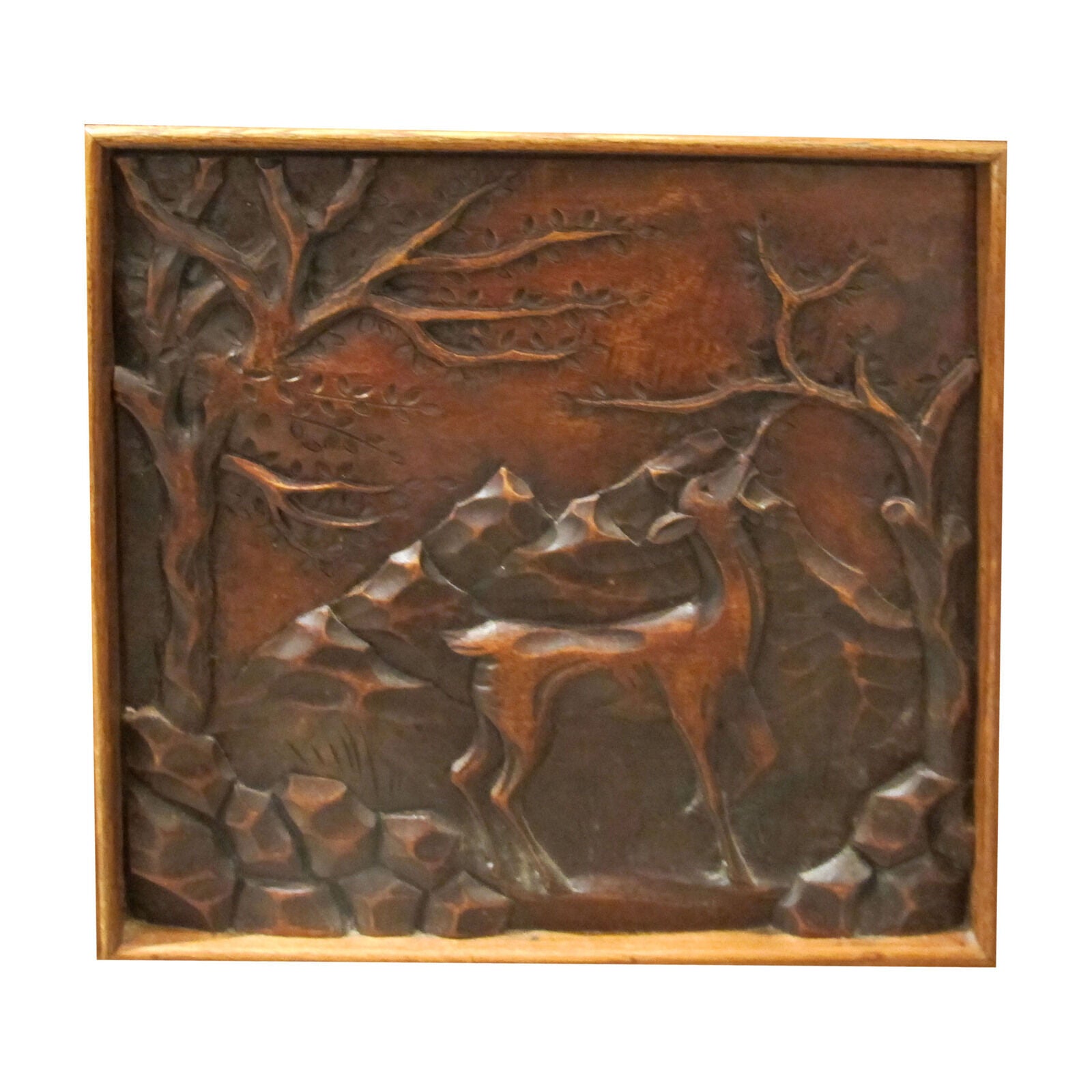Large French sideboard designed by Charles Dudouyt in the 1950s, crafted in solid oak. The design is defined by its strong proportions and clean architectural lines. The front features three doors, each with a deeply carved wooden panel depicting stylised woodland scenes. The warm oak surface shows a fine grain and a well-preserved patina. Raised on a stepped plinth base with rounded block feet, the sideboard offers generous interior storage and combines practicality with decorative presence.