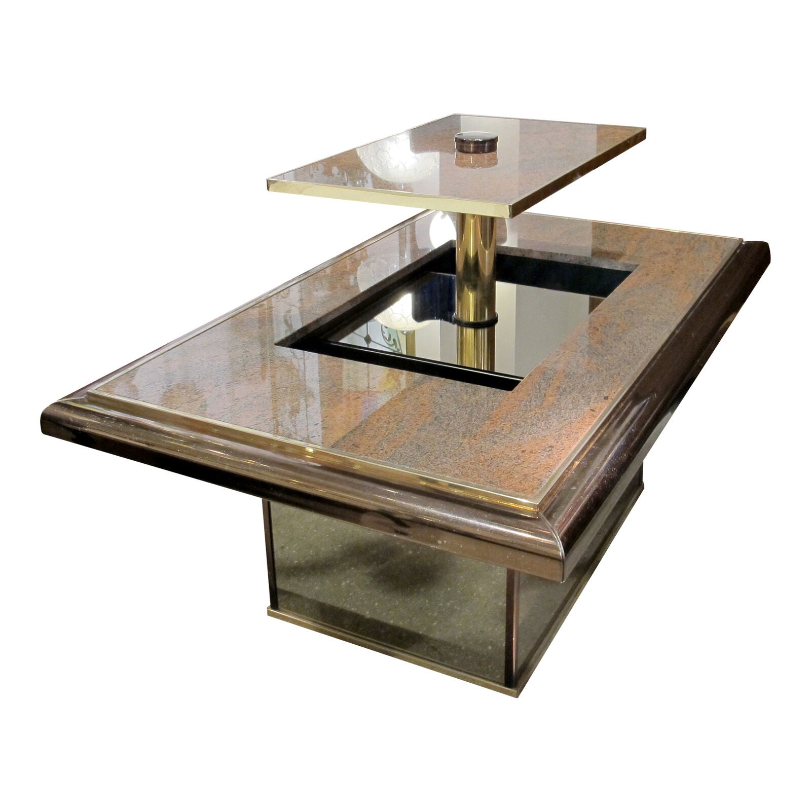 A Belgian table-bar coffee table by Fedam from the 1980s, made of granite, brass, and smoked mirror. The table features a central bar compartment with a mechanised lift that moves up and down with a soft-close mechanism. The combination of materials gives it a solid, refined look typical of the period. A practical and well-designed piece with an integrated bar surface that disappears neatly when not in use. The frame of the table shows some signs of wear, but it does not distract from the overall look of the table.