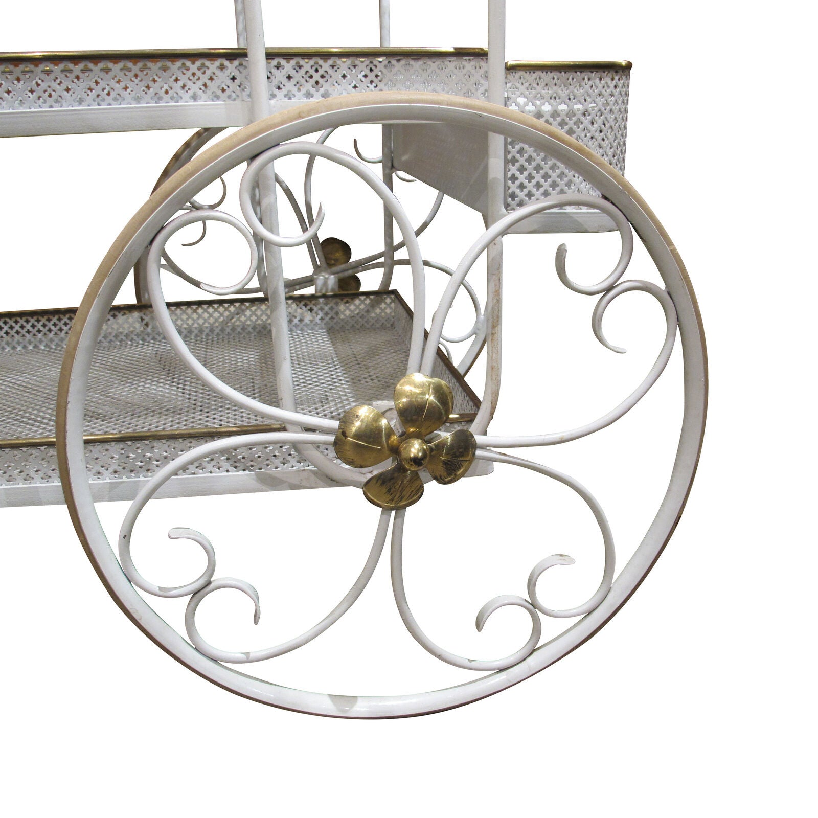 A beautifully designed three-tier serving trolley in the style of Mathieu Matégot, showcasing the refined craftsmanship and sculptural metalwork characteristic of French mid-century design. The trolley features three perforated metal trays, each bordered with elegant brass trims, all removable for convenient serving. Its graceful wrought-iron frame is finished in white, accented by large decorative wheels with scrolling motifs and brass flower hubs. Smoothly rolling and well-balanced, this piece serves as a perfect serving cart or bar trolley.