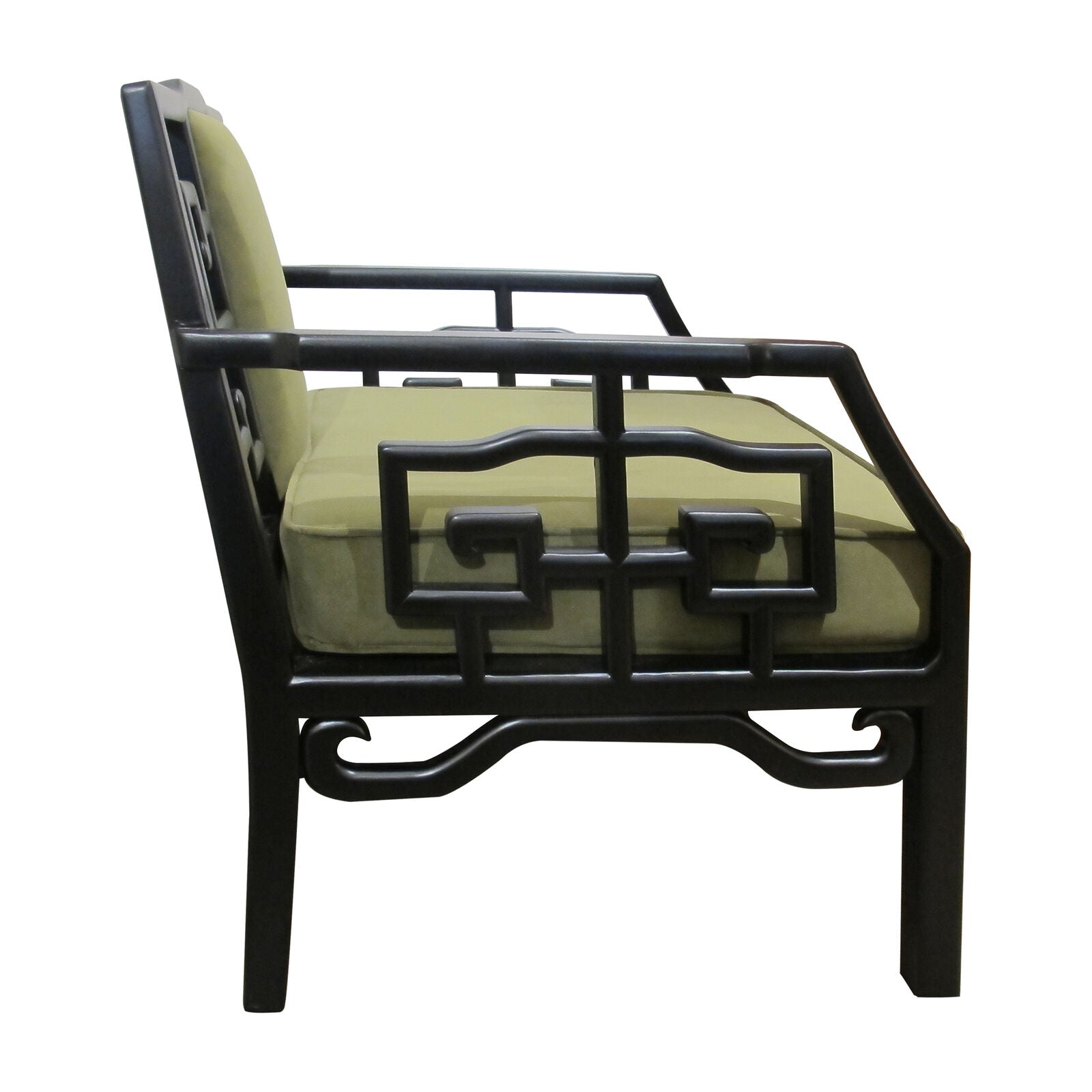 A striking pair of mid-20th-century Chinese armchairs, dating from the 1940s–50s, showcases a refined balance of traditional form and understated modernism. Each chair features a solid hardwood frame finished in a black lacquer, lending a bold architectural presence. The design is distinguished by its geometric fretwork panels along the backrest and arms, inspired by classical Chinese motifs. Generously proportioned seat and back cushions, upholstered in a muted olive-green velvet fabric, provide comfort while complementing the dark frame with a warm, organic contrast.