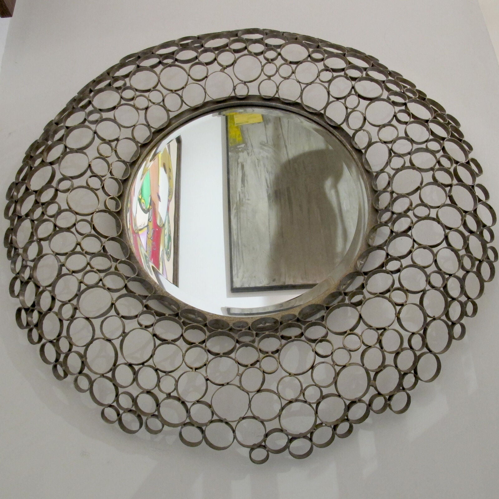 Spanish round wall mirror with a hand-made metal frame composed of interlocking circular rings in various sizes. The frame features a light bronze-toned patina and an openwork design, complemented by a central bevelled mirror, dating from the 1980s. A distinctive decorative piece with a sculptural, geometric look.